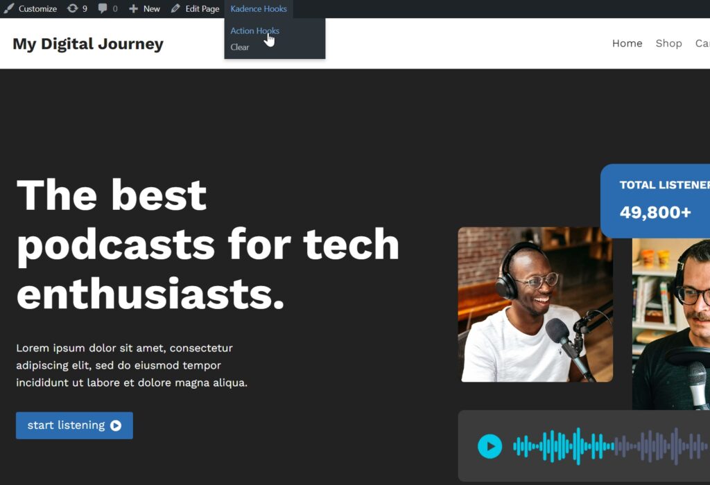 If you want to visualize all Kadence hooks on the frontend, you can install a small plugin called “Visual Hook Guide for Kadence”. Download and activate it. Then go to the frontend of your website and click on Kadence Hooks > Action Hooks in the admin bar.
