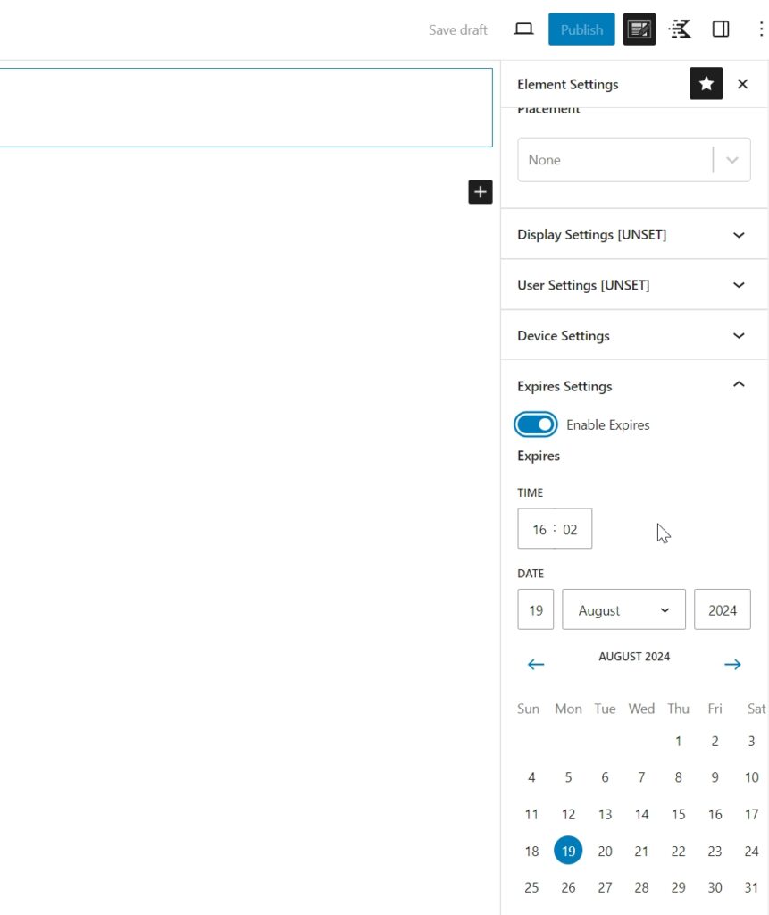 - Device settings and Expire settings are optional. Set them if you only want your element to be displayed on certain screen sizes and if you only want it to appear on your website for a limited time.